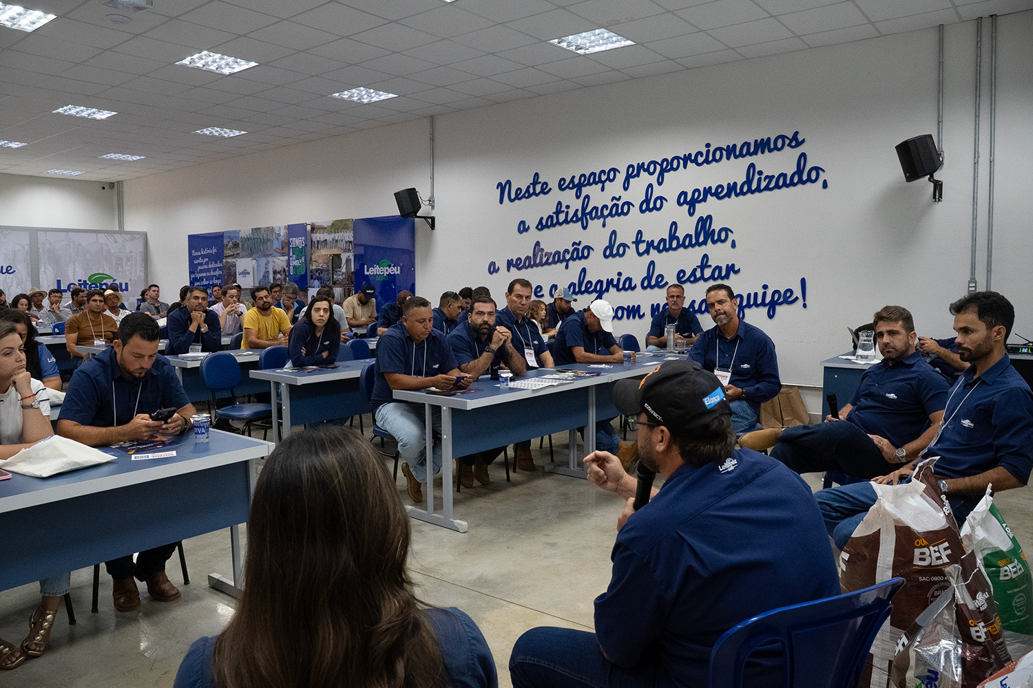 Encerrando as apresentações, nossos especialistas entraram em cena para detalhar o diferencial competitivo da Leitepéu: a Tecnologia Ouro Beef Intense. Foi demonstrado como essa linha de produtos foi desenvolvida para atender às exigências de animais em sistemas intensivos, oferecendo o equilíbrio nutricional exato para maximizar o ganho de peso e a conversão alimentar. A apresentação reforçou como a nutrição de precisão é o motor que impulsiona o lucro dentro da porteira.