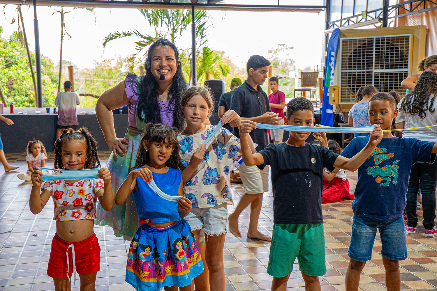 As crianças também colocaram a mão na massa e aprenderam a fazer slime, explorando cores, texturas e muita criatividade.